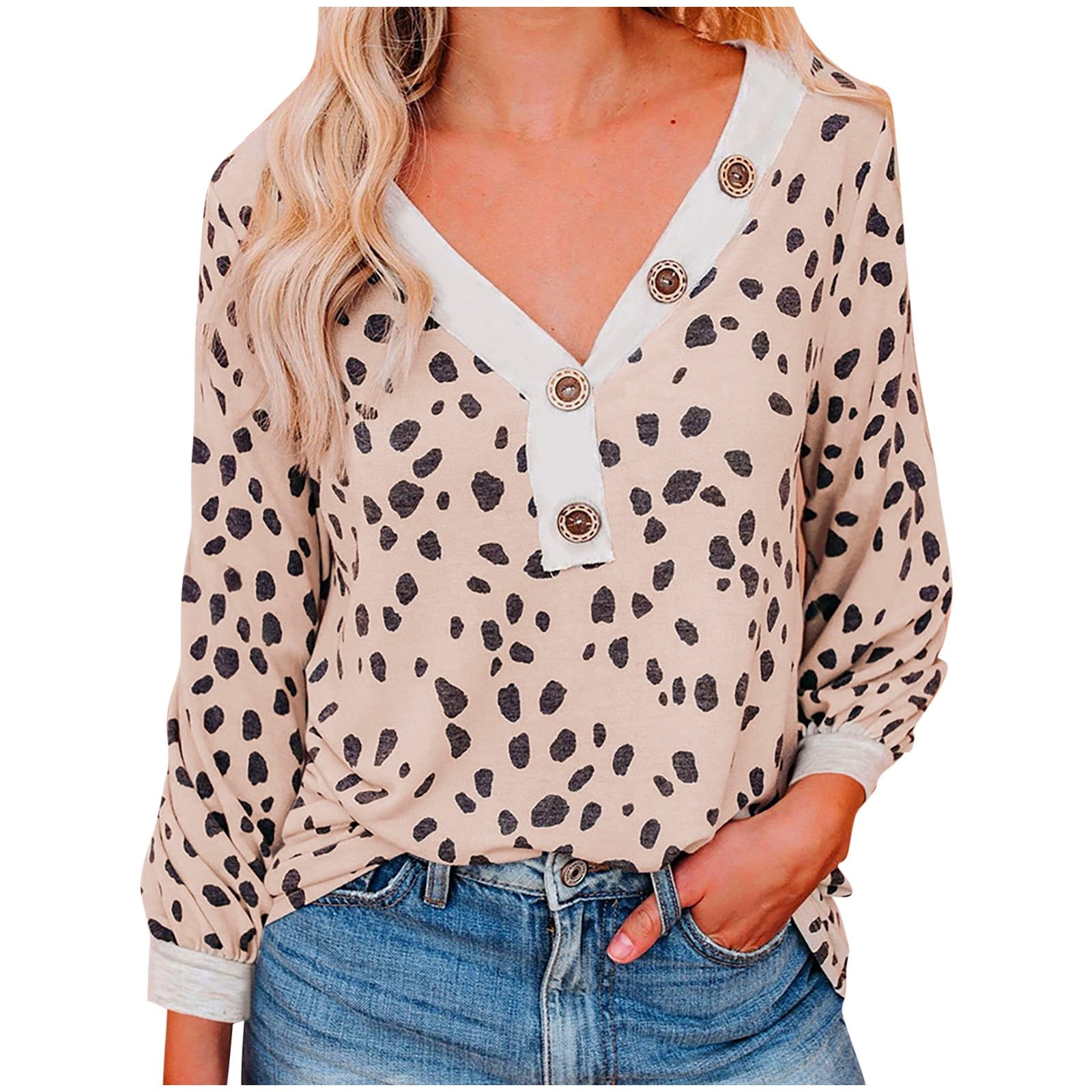 Long Sleeve Bodysuit For Women Womens Long Sleeve Tops Fashion Women V Neck Buttons Decoration Spotted Leopard Print Sweatshirt Top White Blouse For Women White Blouse For Women Beige S Walmart Com